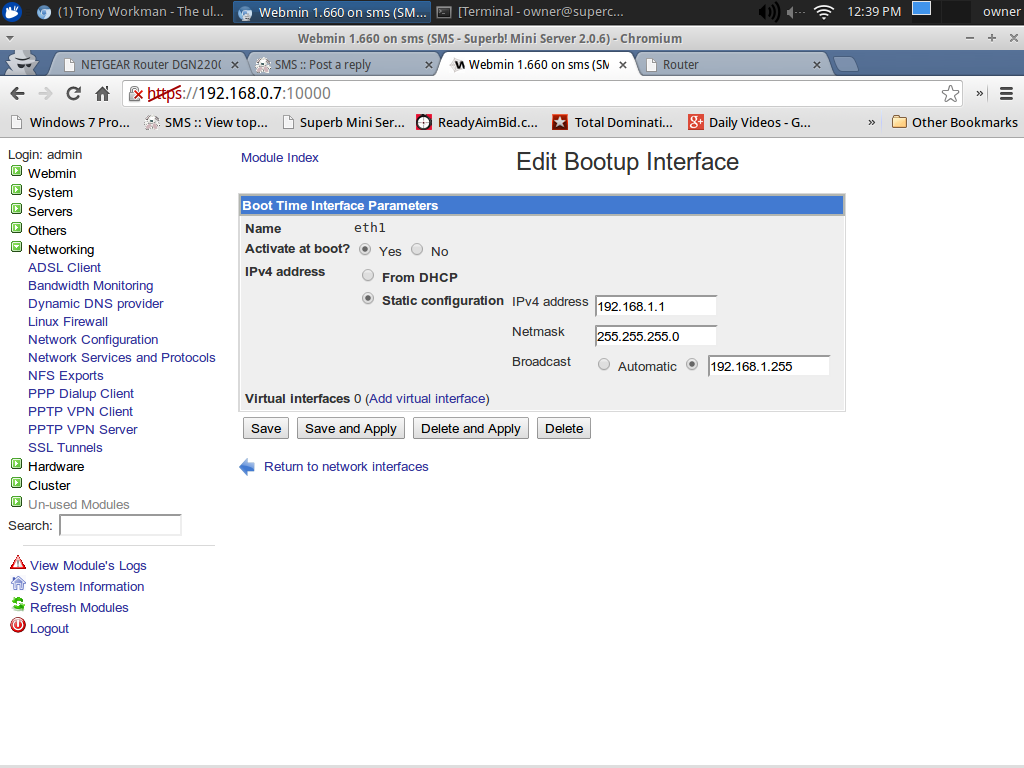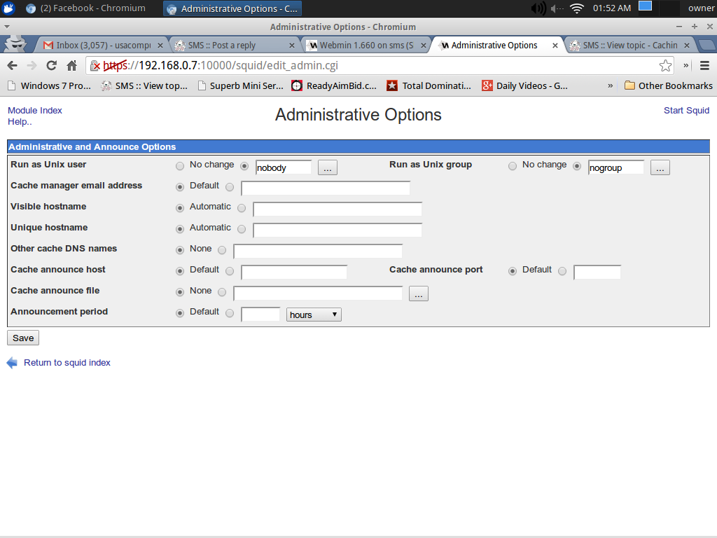 | Thanks. Also I need to know how to make dam sure that when the power button is pressed, that the caching server, dansguardian, and router are started automatically. Somewhere you can put in custom commands and scripts for startup. In the past with sms I always had a problem getting squid to start automatically, and to get squid to use more than 20 MB of RAM. I also am going to have to find the default user and pass for webmin and the port address to use via the browser. I forgot.